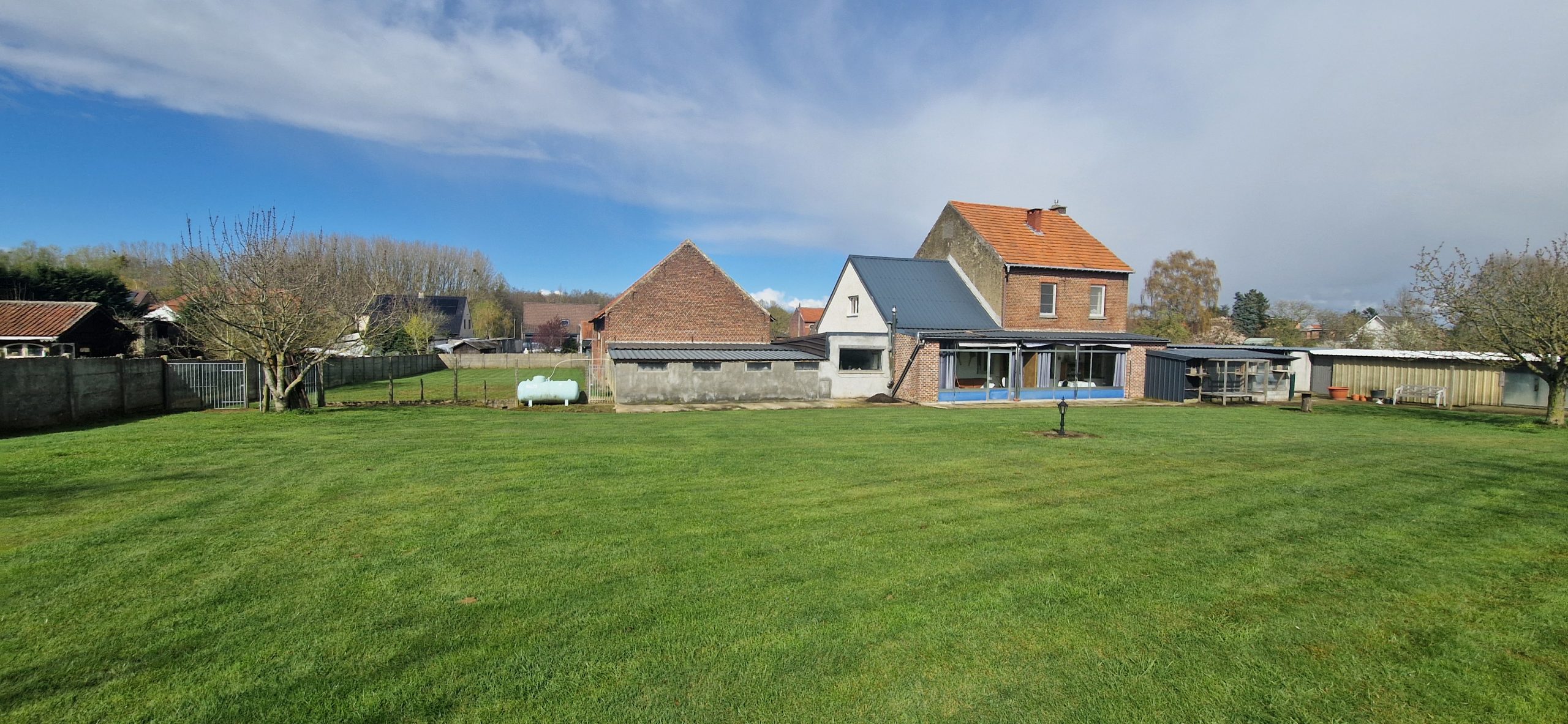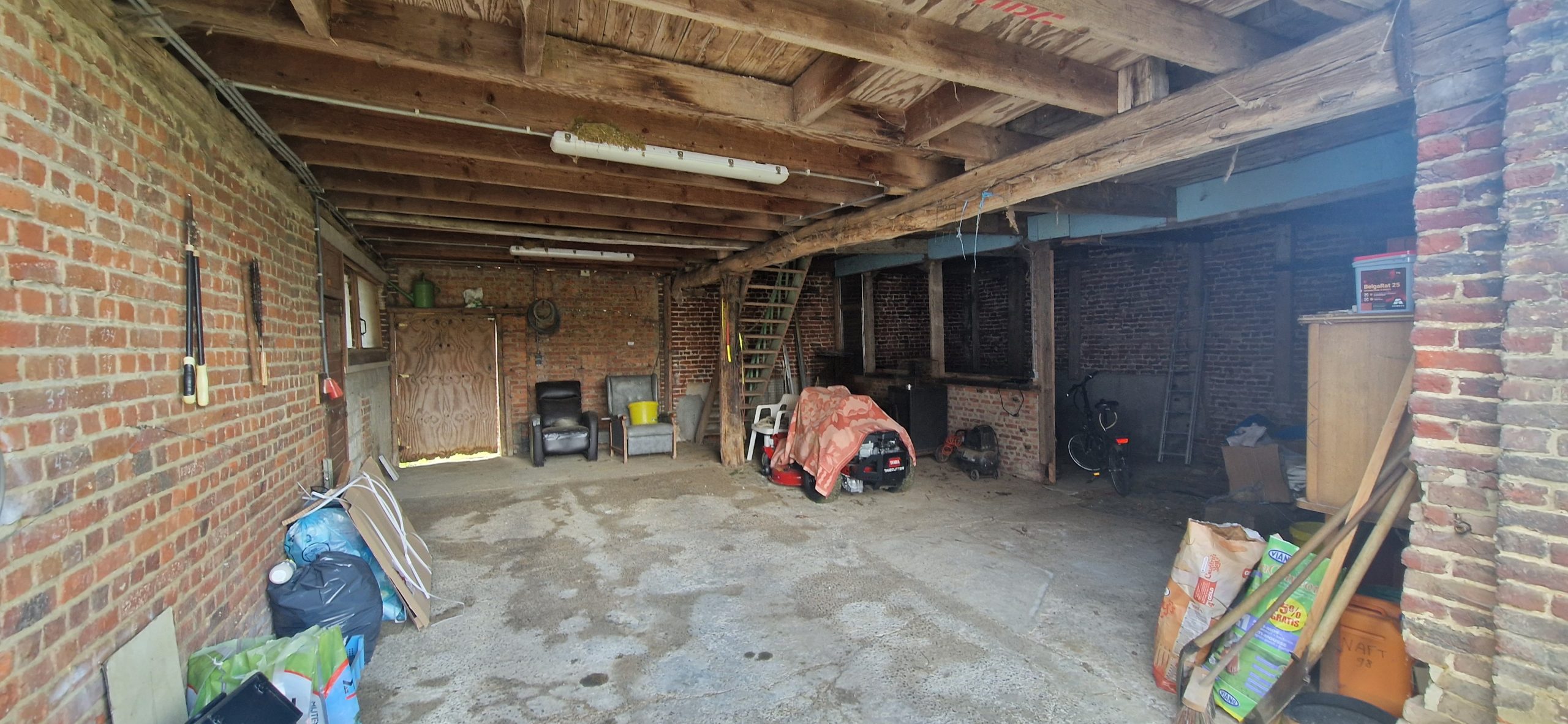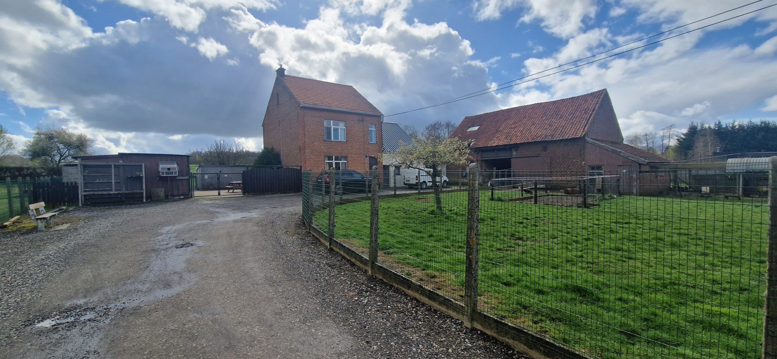 De hoeve met vier slaapkamers, twee badkamers, … Gezellige leefruimte met veranda. Voorzien van kelder. De eigendom omvat aansluitende stallingen en schuren.